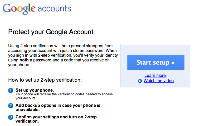 At the next page, click the large blue "Turn on 2-step verification" button.