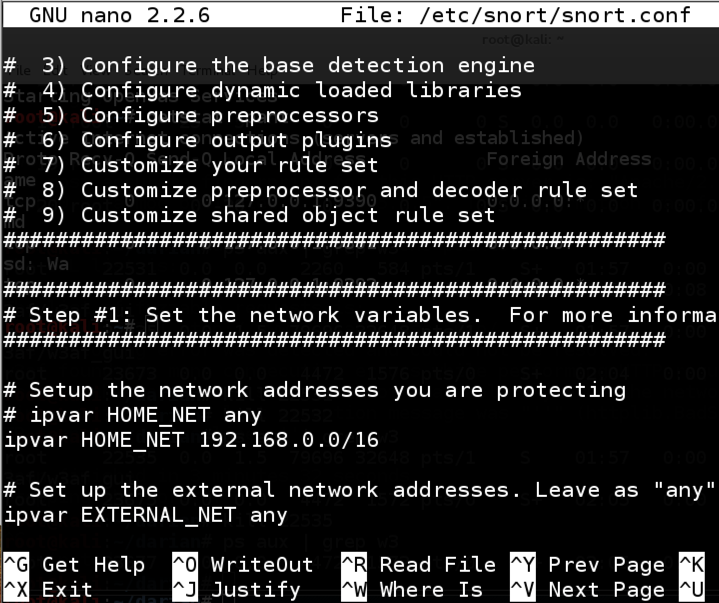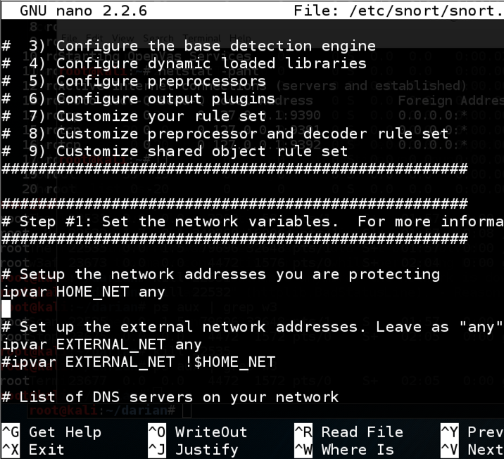 Scroll down to find the "Step #1: Set the network variables" section, as shown below:nano /etc/snort/snort.conf