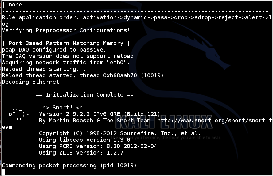 Snort starts, showing an "Initialization Complete" message, as shown below: