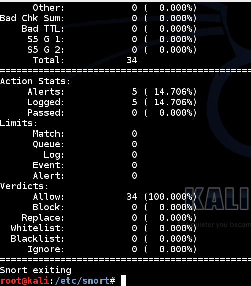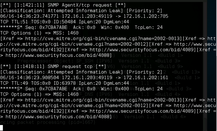 You should see messages scroll by on the Kali64 machine as snort sends alerts about the scans.