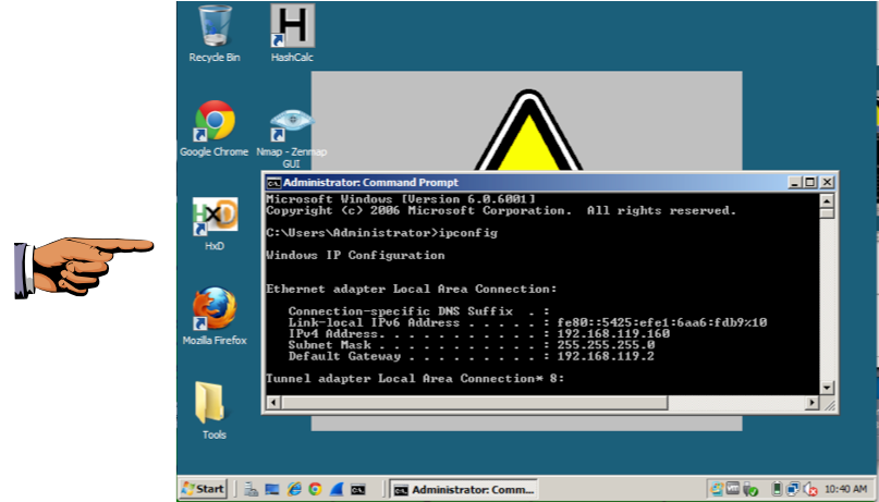 In the Command Prompt screen, type in IPCONFIG and press the Enter key.