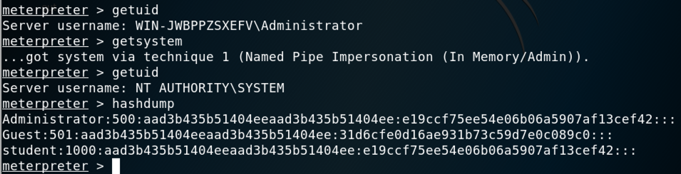 On your Kali machine, at meterpreter > prompt, execute this command: