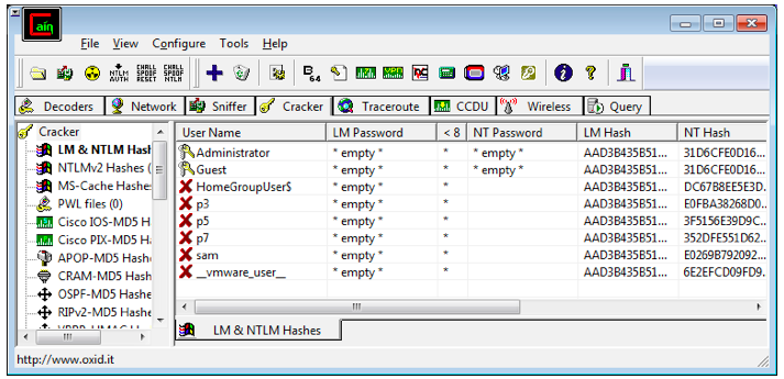 The password hashes appear, as shown in the figure below. The LM hashes will all be the same if you are using Windows Vista or later, but the NT hash contains the password information.