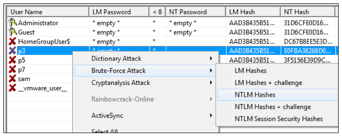 In the right pane, right-click p5, point to "Brute-Force Attack", and click "NTLM Hashes".