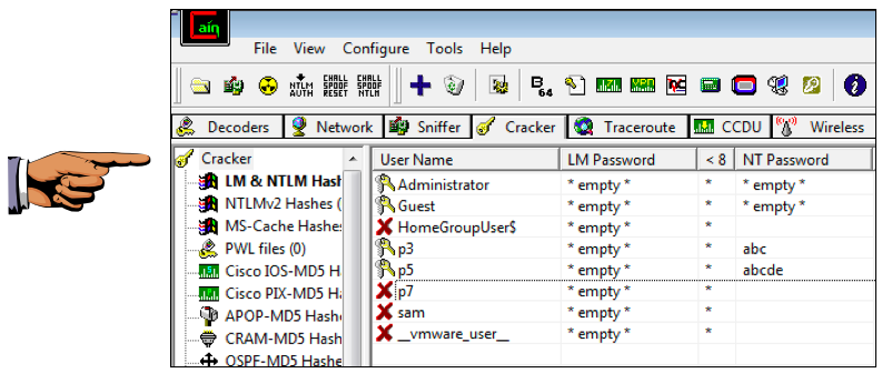 You should see the two passwords you found, abc and abcde, in the NT Password column of the Cain window, as shown below.