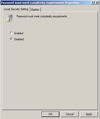 In the "Password must meet complexity requirements Properties" box, click Disabled, as shown below.