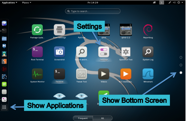 On the right side of the Kali 2.0 desktop, click the lowest circle to show the bottom screen.