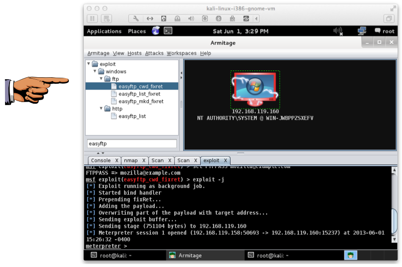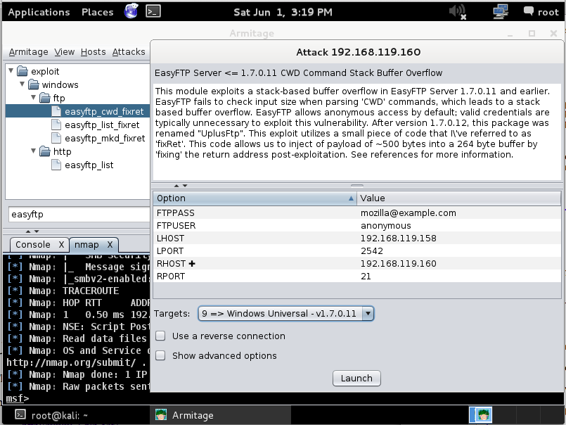 If you see an error message saying "connection refused", that usually means the EasyFTP service crashed. It does that a lot. To fix it, on the Windows server, click Start, type in SERVICES, open the Services console, and restart the EasyFTP service. Then try the exploit again.Another way to test the FTP service is to open a Terminal on the Kali machine and execute this command, replacing the IP address with the IP address of your Windows machine: