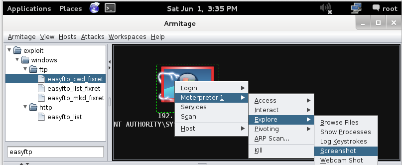 Right-click the target computer icon, and click Meterpreter, Explore, Screenshot, as shown below.