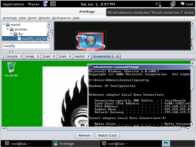 The Target machine's desktop appears in the lower pane of Armitage, as shown below.