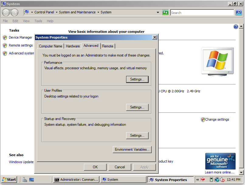 In the "System Properties" sheet, click the Advanced tab, as shown below: