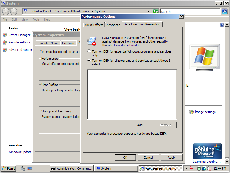If you see a message at the bottom of this box saying "Your hardware does not support DEP", this indicates either that your computer is very old, or, far more likely, DEP is disabled in the BIOS.Close all windows and restart the machine. Press the function key to get into the BIOS and enable DEP before proceeding.