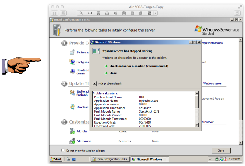 A "Microsoft Windows" box appears, with the message "ftpbasicsvr.exe has stopped working", as shown below.