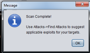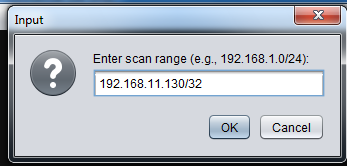 A box pops up saying "Enter scan range (e.g., 192.168.1.0/24):". Type in your target machine's IP address with a /32 added to the end of it, as shown below. Click the OK button.