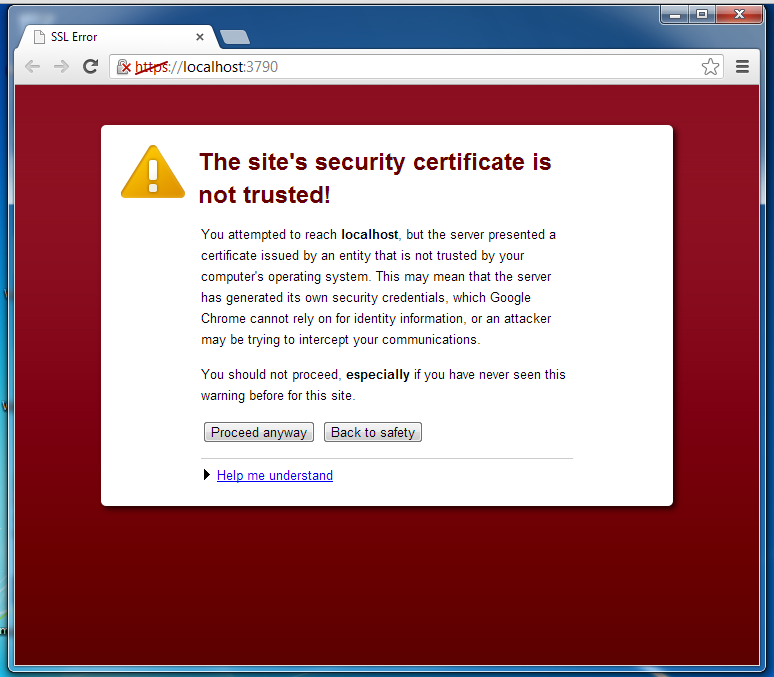 When the installation is done, a Web browser pops up with a warning about an untrusted security certificate, as shown below.