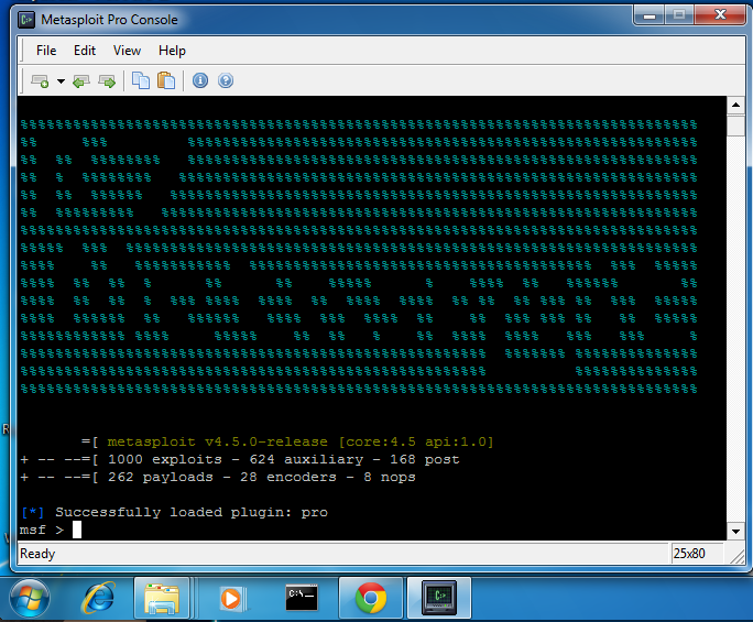 On your Windows 7 host machine's desktop, click Start, "All Programs", Metasploit, "Metasploit Console".