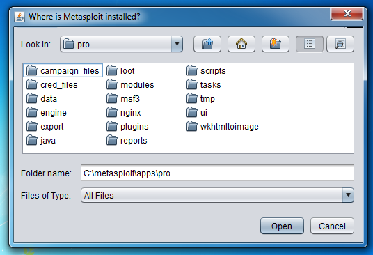 Navigate to C:\metasploit\apps\pro, as shown below, and click the Open button.