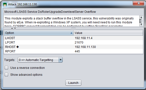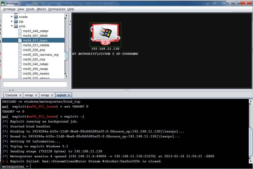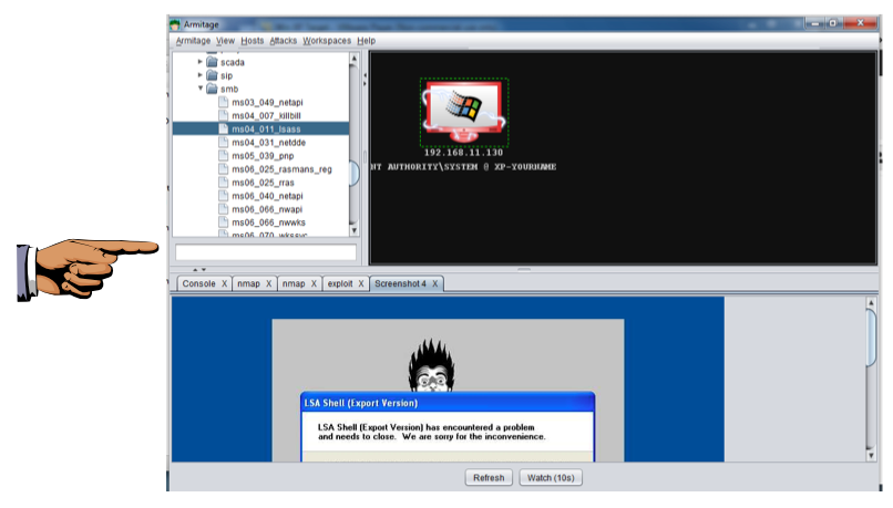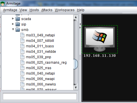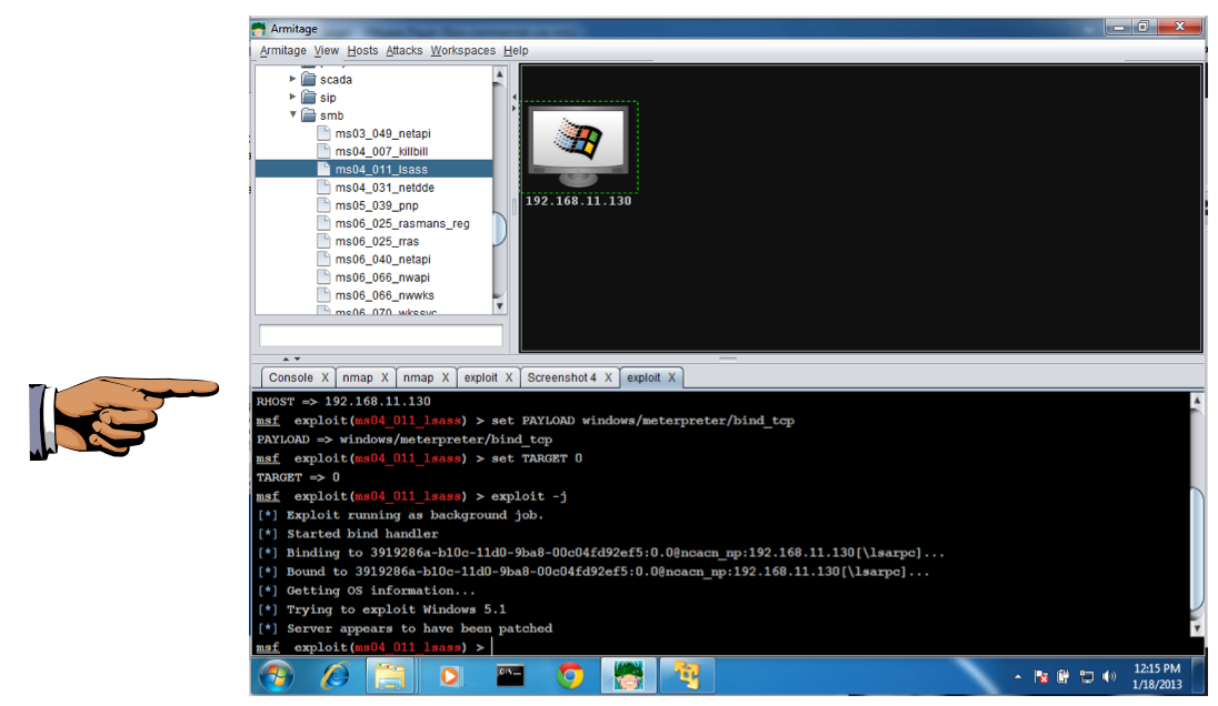 Click ms04_011_lsass, hold down the left mouse button, drag it onto the computer icon showing your target's IP address, and drop it there.