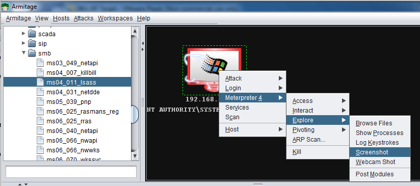 Right-click the target computer icon, and click Meterpreter, Explore, Screenshot, as shown below.