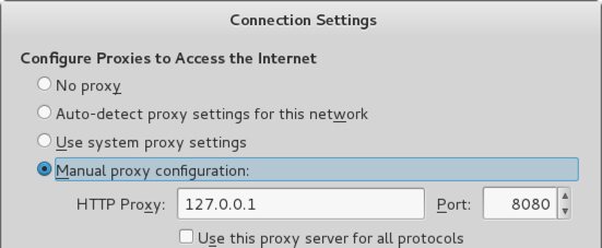 Select a Proxy of 127.0.0.1, port 8080, as shown below.