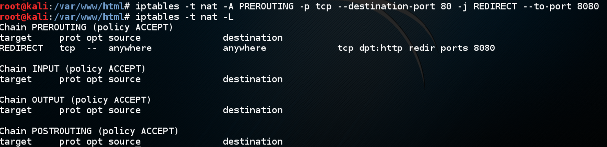 iptables -t nat -A PREROUTING -p tcp --destination-port 80 -j REDIRECT --to-port 8080