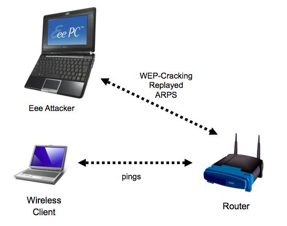 Wireless Client: Use any computer with a wireless card. Connect to the wireless router, typing in the ten-character key when you are prompted to. Disable all other network adapters on the wireless client computer. On the wireless client, enter this command to send a constant series of pings to the router, using your router's IP address instead of the example address below: