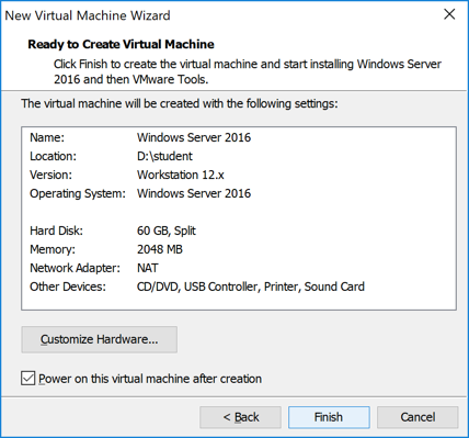In the "Ready to Create Virtual Machine" box, click the Finish button.