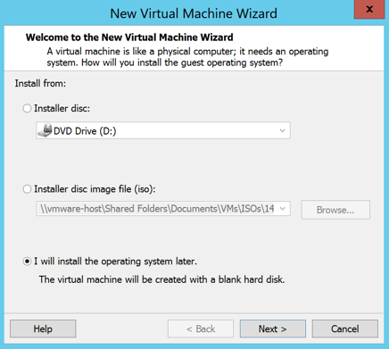 In the "Welcome to the New Virtual Machine Wizard" screen, click the "I will install the operating system later." button, as shown below.