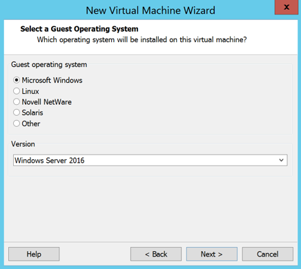 In the "Select a Guest Operating System" box, select "Microsoft Windows" and "Windows Server 2016", as shown below.