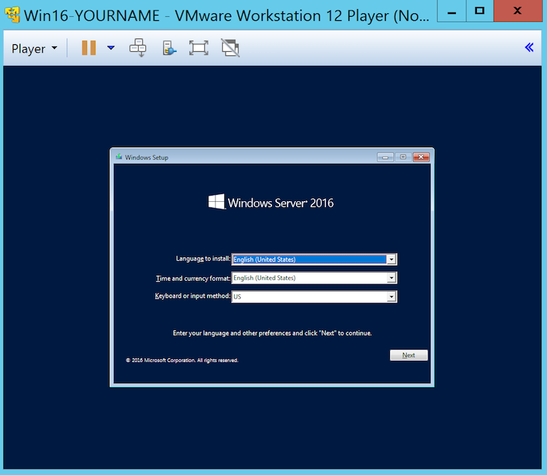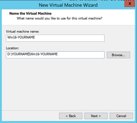 In the "Name the Virtual Machine" box, enter a Virtual machine name of Win16-YOURNAME, replacing "YOURNAME" with your own name, as shown below.