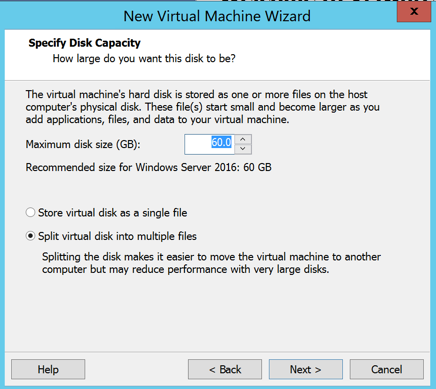 In the "Specify Disk Capacity" box, accept the default options, as shown below, and click Next.