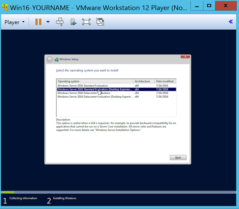 In the "Select the operating system you want to install" box, click "Windows Server 2016 Standard Evaluation (Desktop Experience)", as shown below.