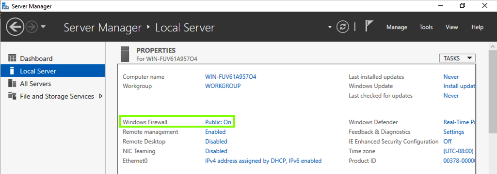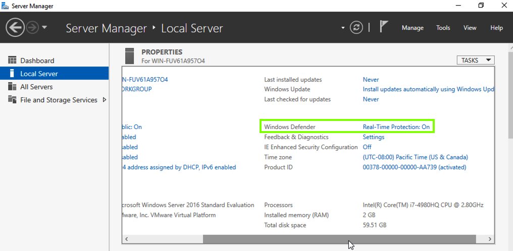 In Server Manager, on right side, find "Windows Defender". Click the word On next to it, as shown below.