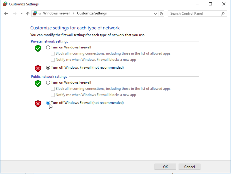 In the "Customize Settings" box, click both Off buttons, as shown below.