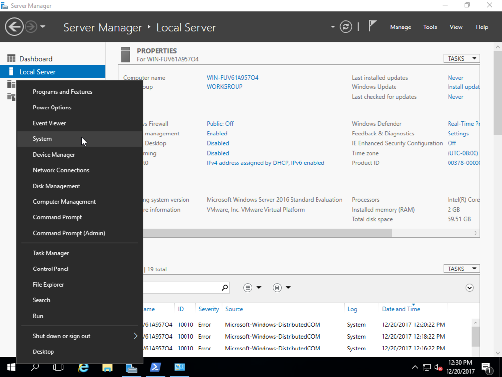 On your Windows Server 2016 desktop, at the lower left, right-click the Start button and click System, as shown below.