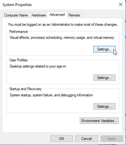 In the "System Properties" box, click the Advanced tab. In the Performance section, click the Settings... button, as shown below.