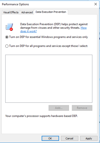 In the "Performance Options" box, click the "Data Execution Prevention" tab. Click the "Turn on DEP for essential Windows programs and services only" button, as shown below.