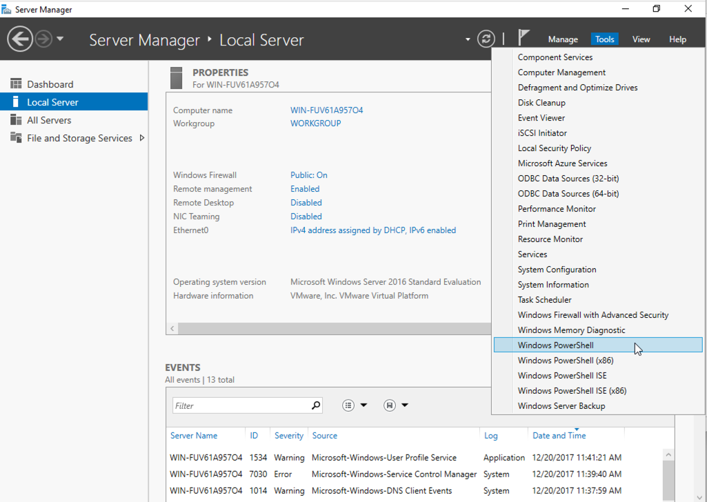 On your Windows Server 2016 desktop, in Server Manager, on the top right, click Tools, "Windows PowerShell", as shown below.