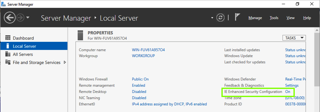 In Server Manager, on right side, find "IE Enhanced Security Configuration". Click the word On next to it, as shown below.