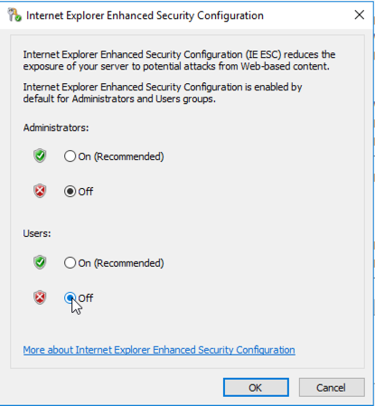 In the "Internet Explorer Enhanced Security Configuration" box, click both Off buttons, as shown below.
