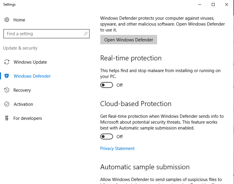 In the "Settings" box, turn off both "Real-time protection" and "Cloud-based protection" buttons, as shown below.