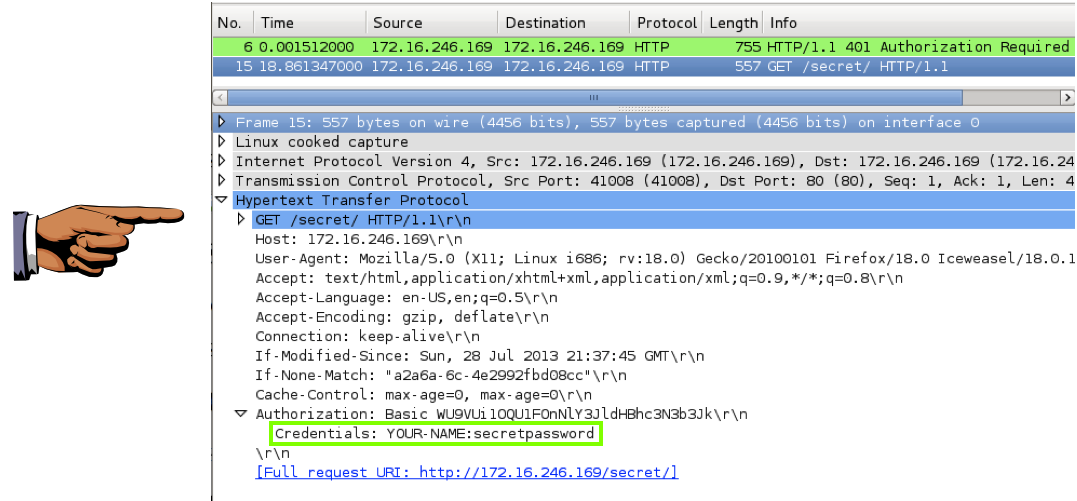 The credentials are shown in cleartext, showing your name and the secret password, as shown below: