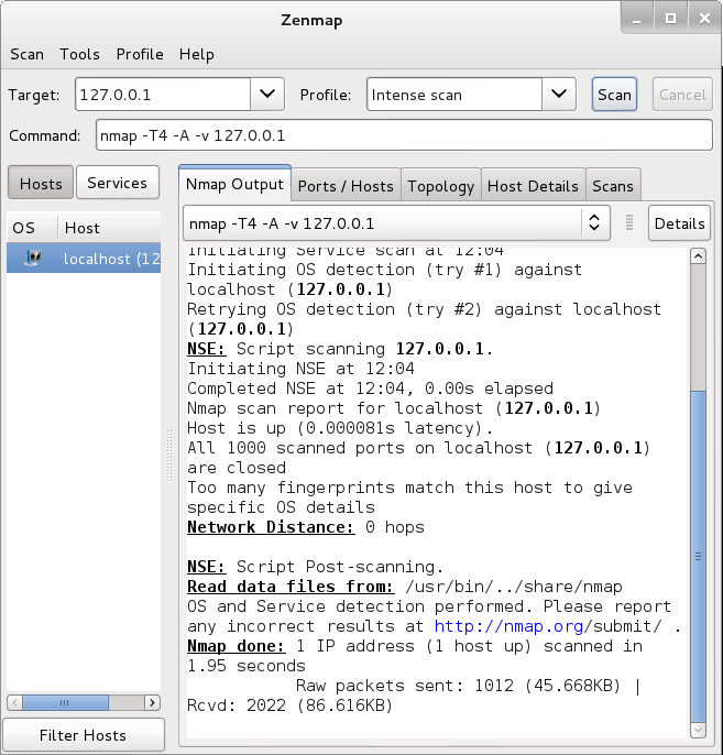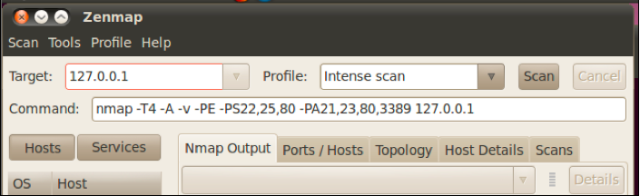 In the Zenmap window, enter a Target: of 127.0.0.1