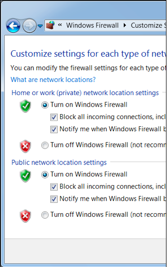 In the "Customize Settings" box, in the "Home or work (private) network location settings" section, click the "Turn on Windows Firewall" button and check the "Block all incoming connections..." box, as shown below on this page. Make the same adjustments in the "Public network location settings" section. Click the OK button.