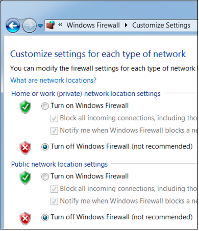 In the "Customize Settings" box, in the "Home or work (private) network location settings" section, click the "Turn off Windows Firewall" button, as shown below. Make the same adjustment in the "Public network location settings" section. Click the OK button.
