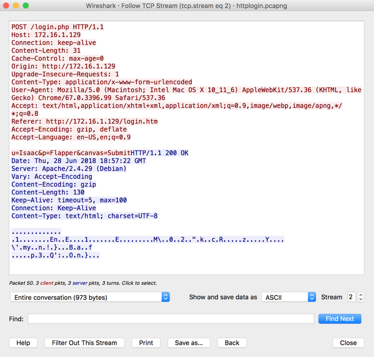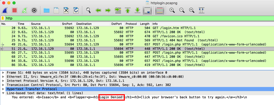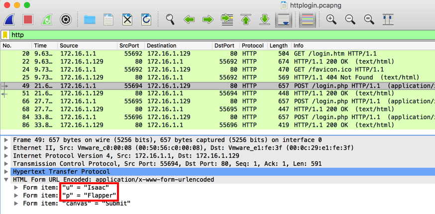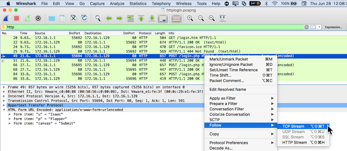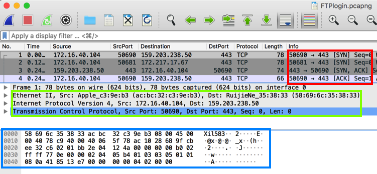 - Packet Details in the middle pane, showing the first four TCP layers. Notice MAC addresses at layer 2, IP addresses at layer 3, and TCP port numbers at layer 4, outlined