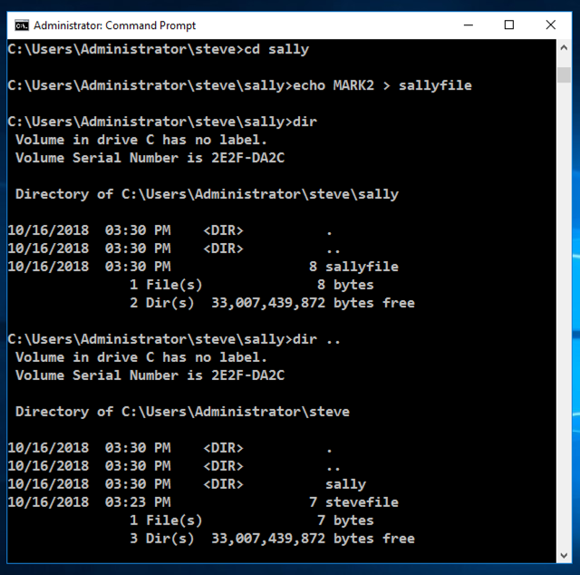The "dir .." command shows the contents of the folder above "sally" folder, also called its parent. Notice that ".." allows you to use a folder that is outside the working directory, by specifying a relative path, which specifies how to get to the desired directory from the current working directory. This is called "directory traversal".