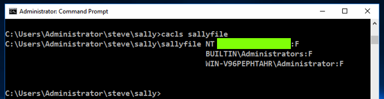 cacls sallyfileThis command shows the Access Control List for the "sallyfile" file.