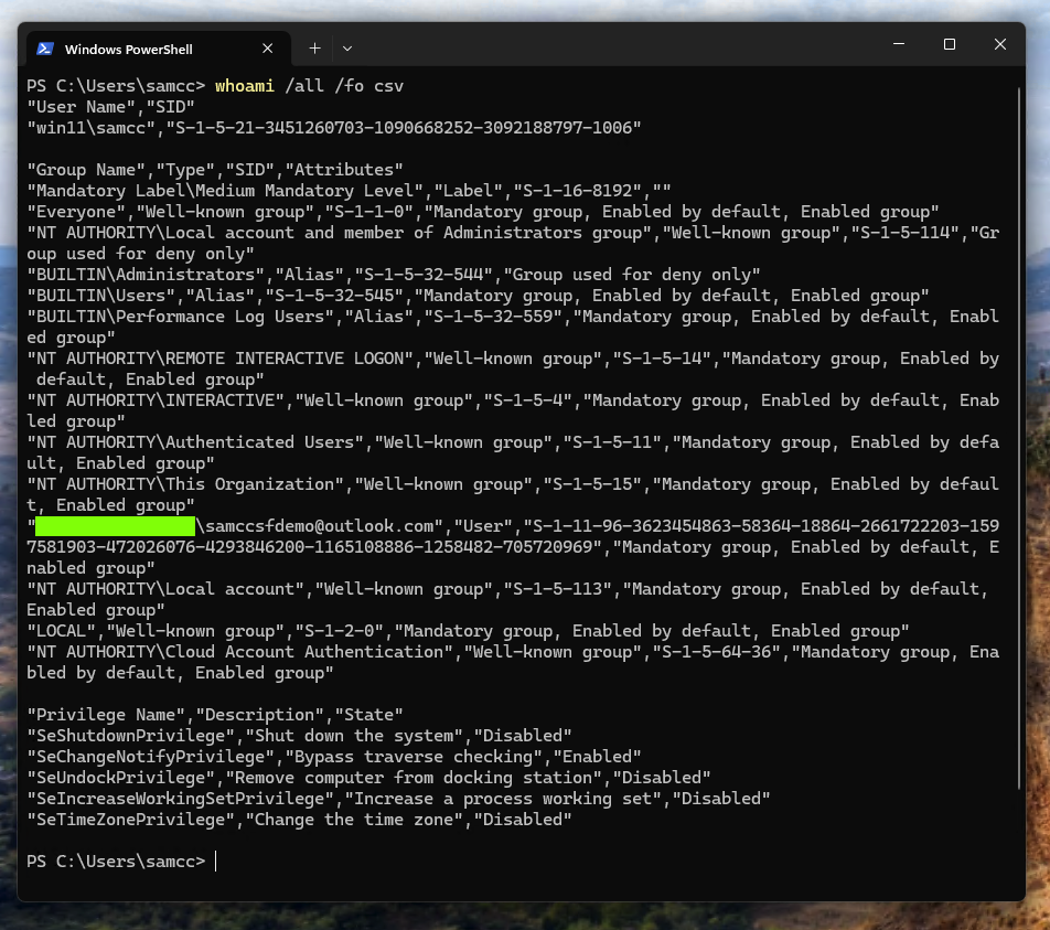 The flag is covered by a green rectangle in the image below.whoami /all /fo csv