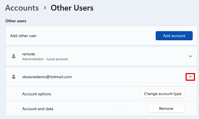 In the "Accounts > Other Users" page, find the name of your new account, and click the down-arrow next to it, outlined in red in the image below.